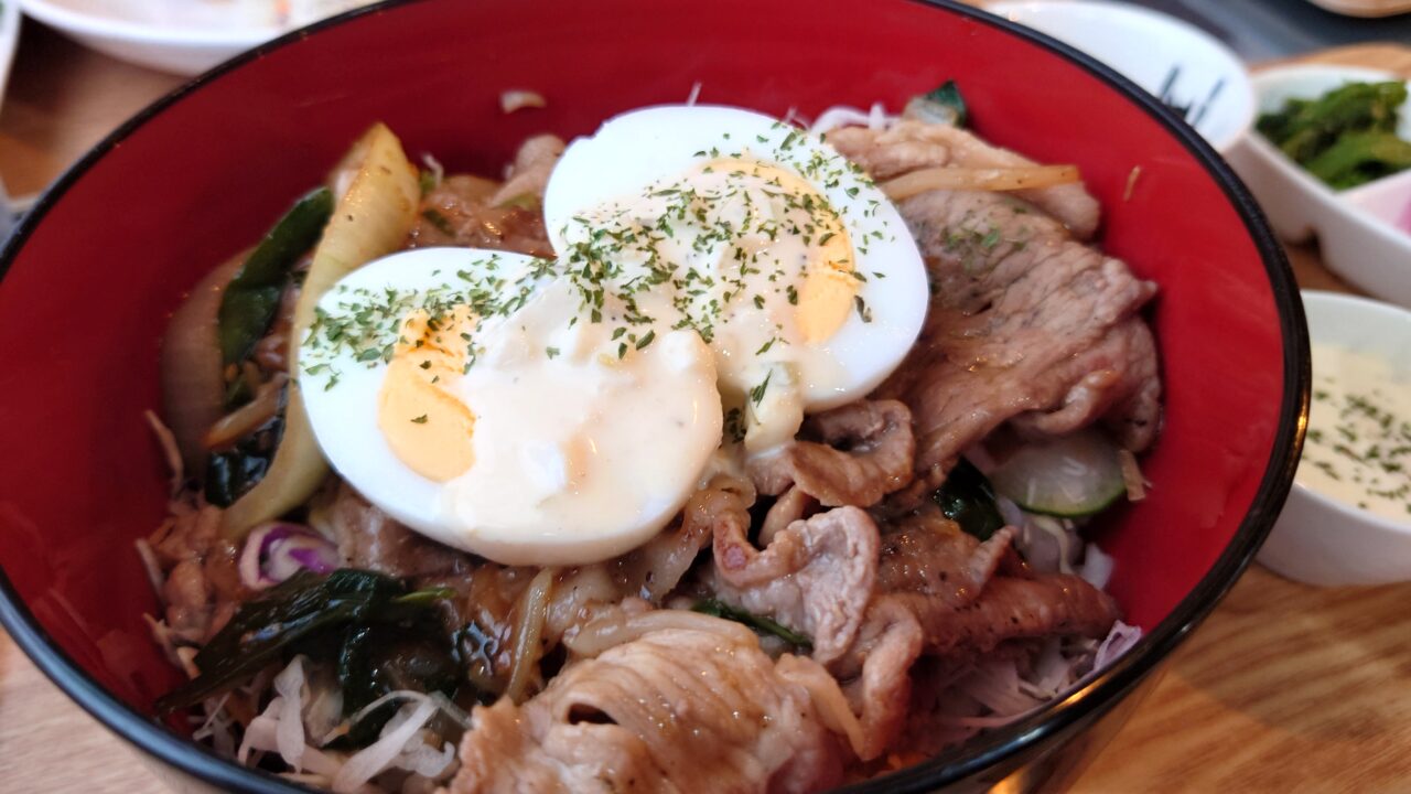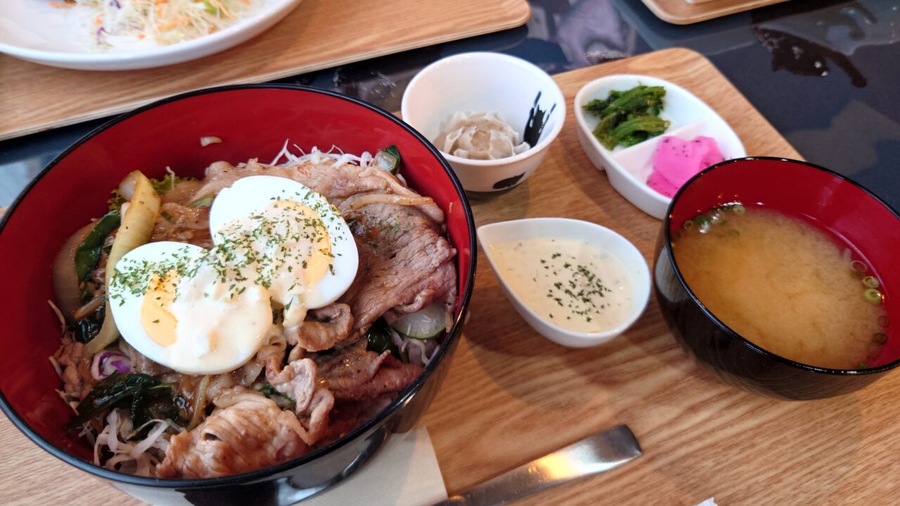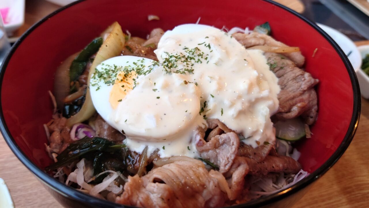ご飯に千切りキャベツ等の野菜を被せ、その上に豚肉と玉葱、ニラを甘辛く煮てゆで卵にタルタルソースが掛かった丼。追いタルタル、香の物と味噌汁、焼売付き。