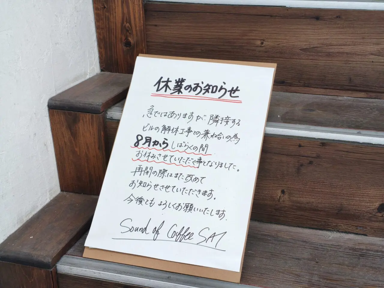 常磐街商店街にある、ハイクオリティで大人気のカフェ「サウンド オブ コーヒー SAI」も工事の影響でしばらくお休みされているようです。