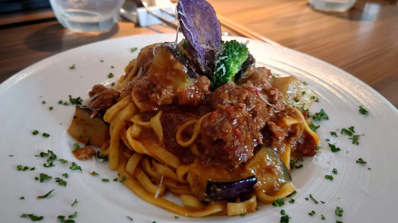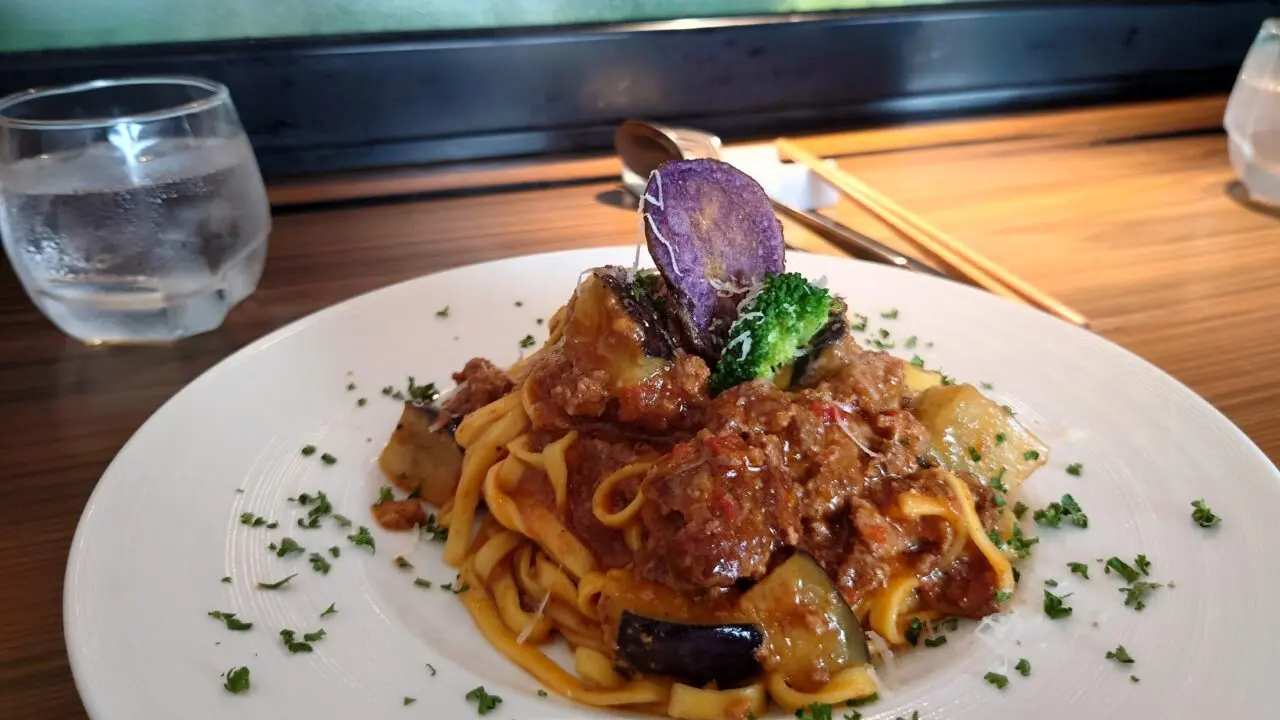 讃岐もち豚と茄子のボロネーゼ(大盛)。大盛だと成人男性でも満足のボリュームですね。讃岐もち豚がゴロゴロとふんだんに使われた平麺のパスタ。ミートソースが適度にスパイシーで上に載ってる紫芋のチップスが香ばしくてこれまた美味しい。