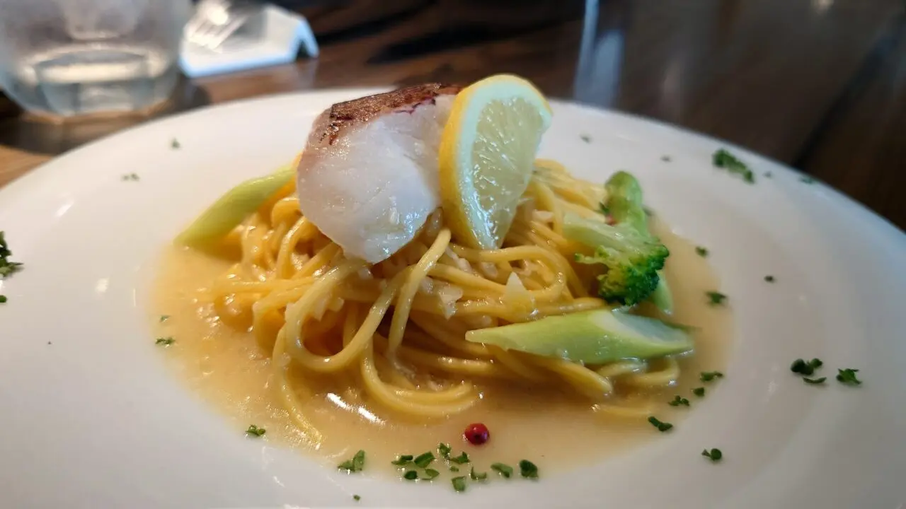 真鯛のレモンバターソース。さっぱりとした柔らかい鯛と、細麺に良く絡むレモンバターの風味が美味の一皿。
