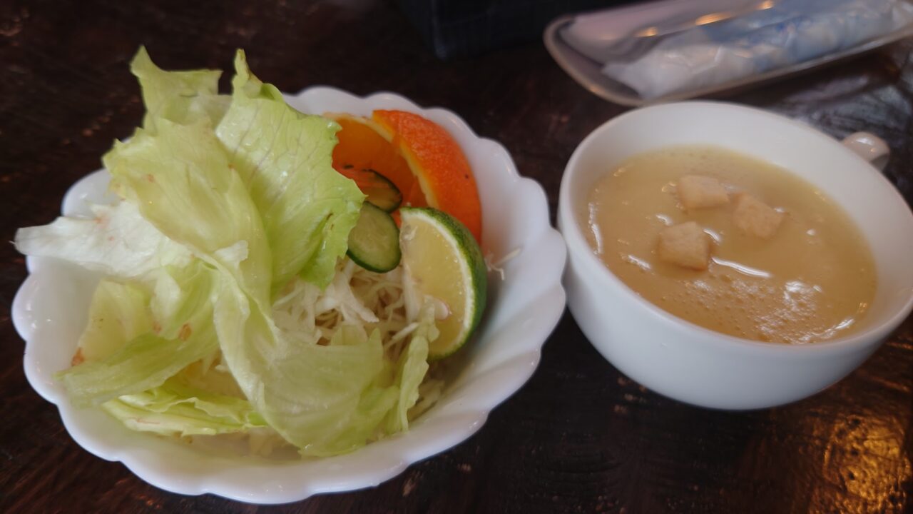 熱々のコーンポタージュスープとセットに付いてくるサラダ。