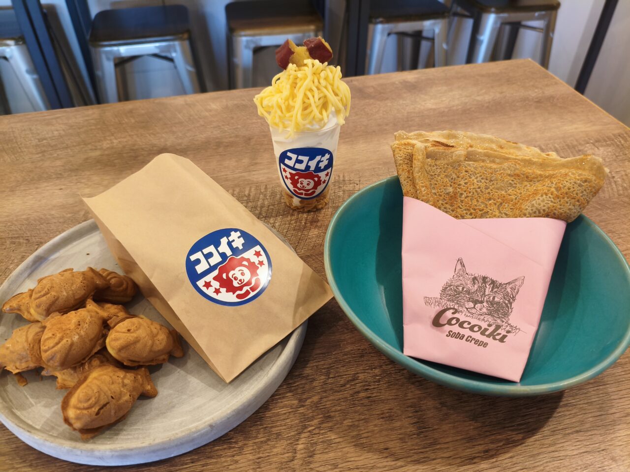 国産のこしあんを使用した焼きたての「たい焼き」(5個500円~)や、濃厚なミルクの香りが広がるソフトクリームとパフェを組み合わせた「おいも」(820円)など、見た目もかわいいスイーツが並びます。