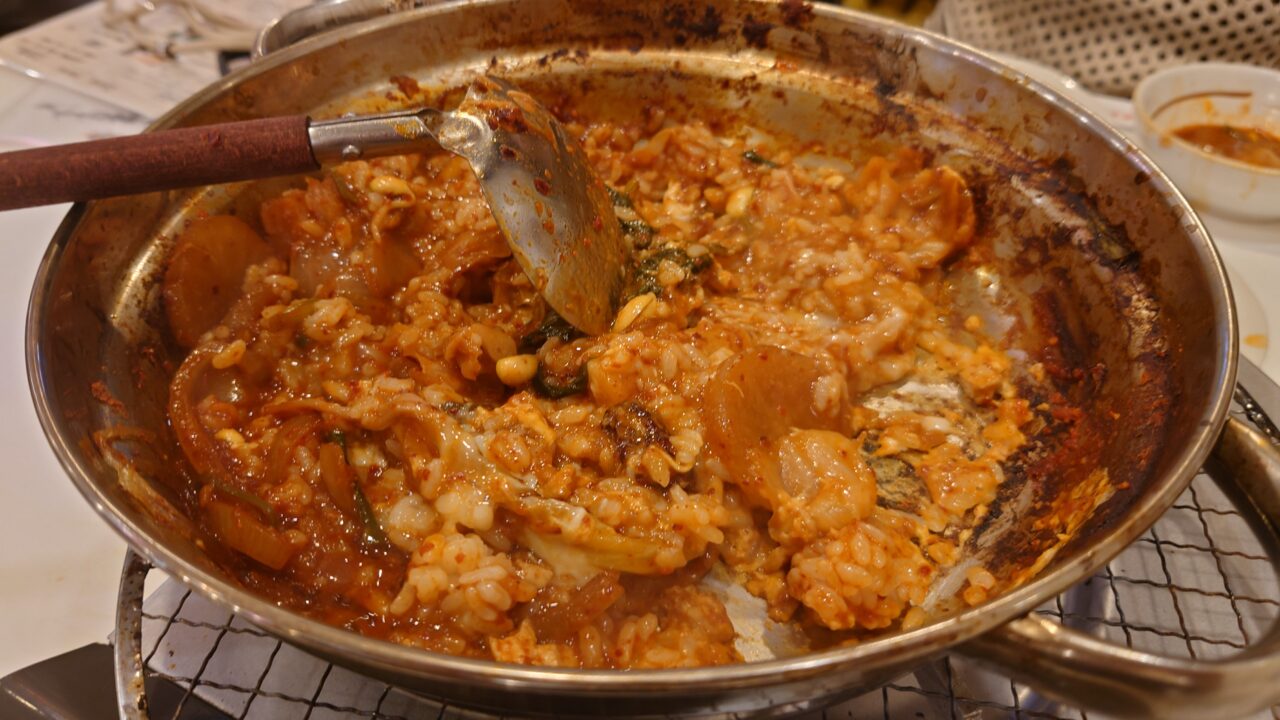 食べ終わりには、ご飯を投入して「ポックンパ(炒めご飯)」に仕上げるのが王道です。複数人でシェアするのが楽しい一皿。
