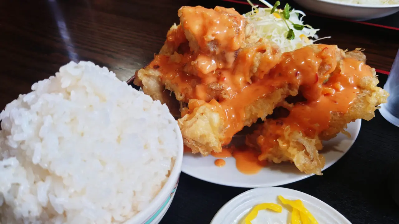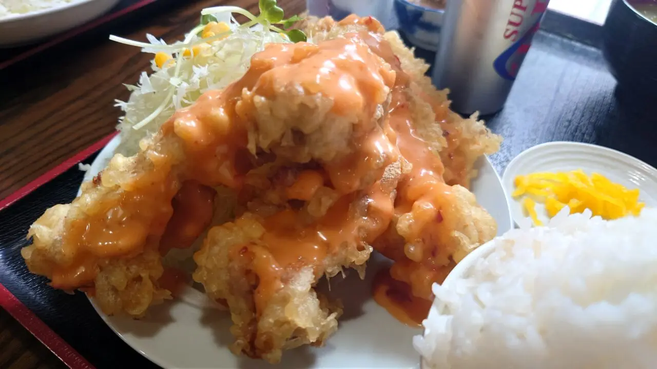 とり天のこのボリューム。揚げたてサクサクの柔らかい鶏肉に辛すぎないマヨチリソースが良く合い、味の方も濃過ぎずアッサリ目で美味しい。