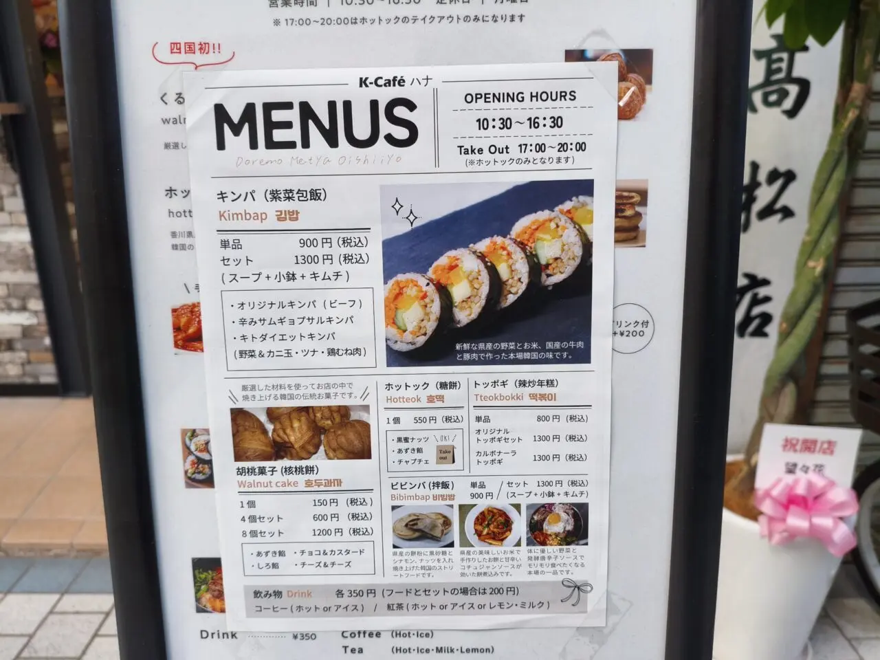看板メニューの「オリジナルキンパ」(単品900円・スープ、小鉢、キムチのセット1300円)は、プルコギと新鮮な野菜や県産米、国産牛・豚を使用。