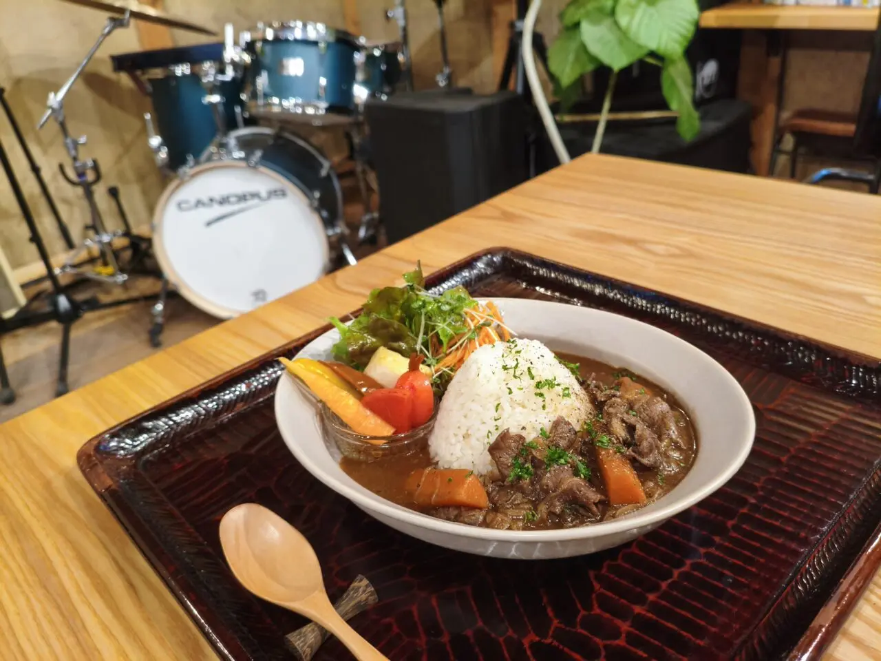 カフェスペースは楽器のセットもあり、空間も広々としています。