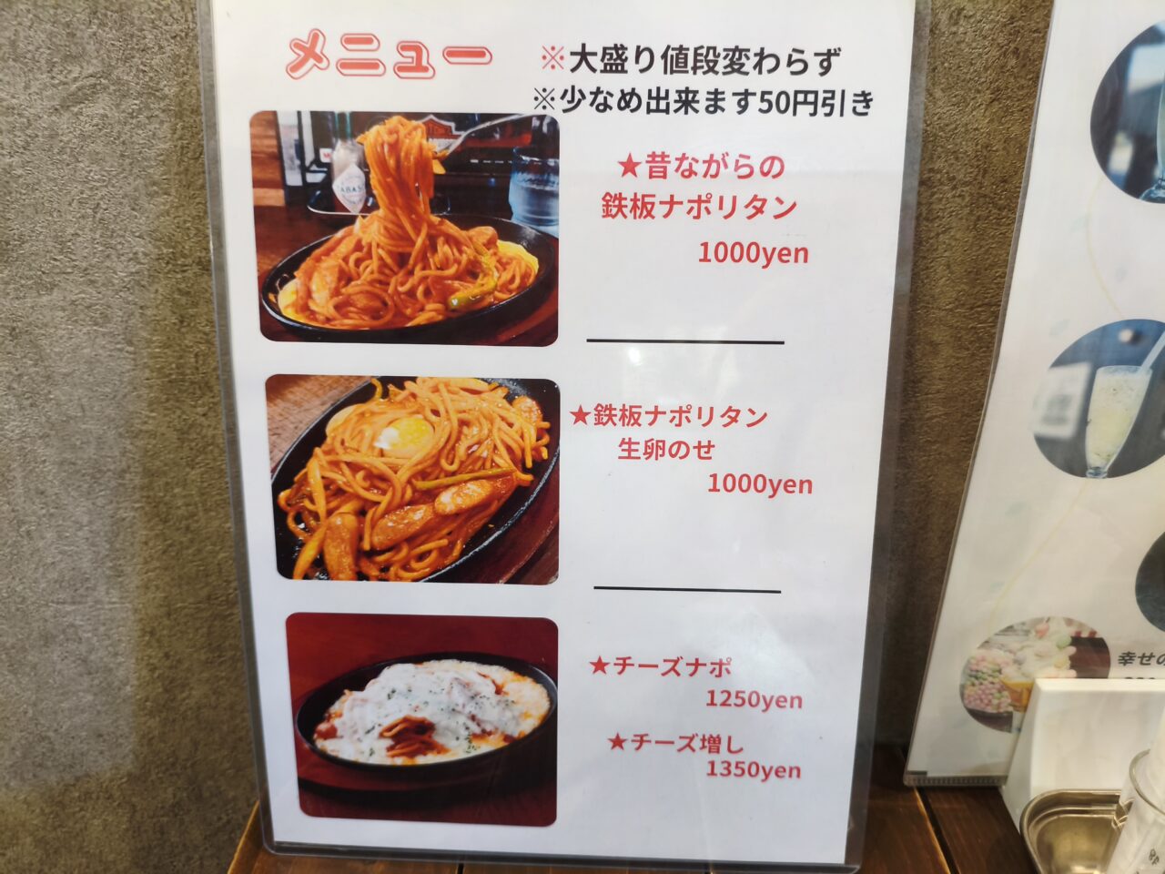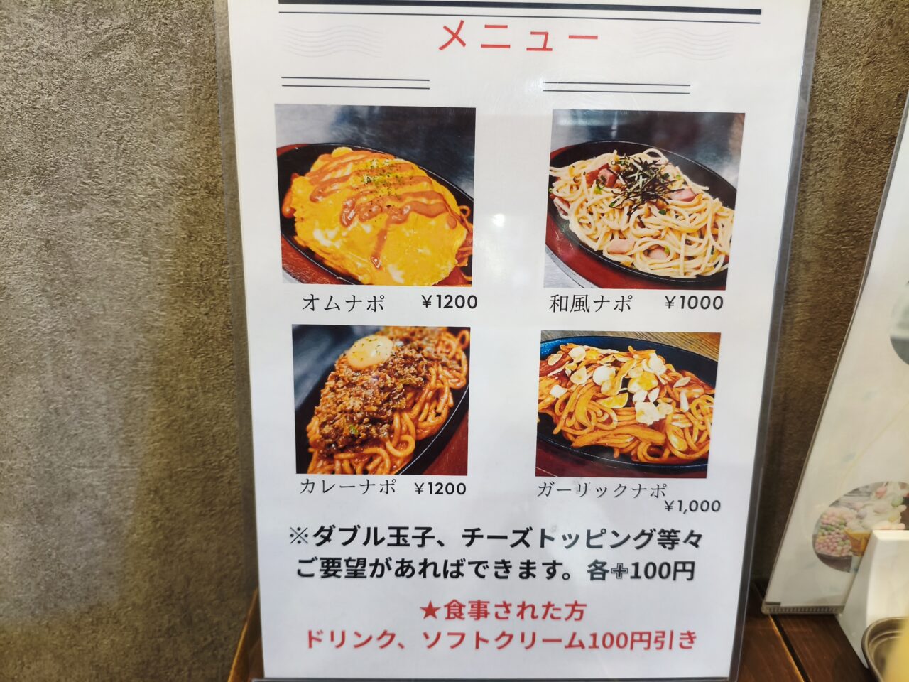 お店に入るとナポリタンの香しい匂いが漂い、満腹状態ながら思わず注文しそうになりました。