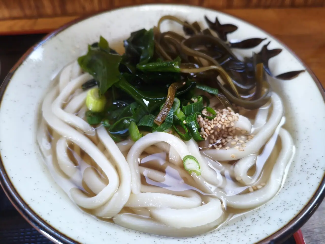 初訪問のうどん屋さんを知るにはシンプルな「かけ」を頂くのがベストという事で注文。カウンターで注文後、丼を受け取って支払いをした後、カウンターの隅にあるワカメや昆布、葱の無料トッピングで豪華に!