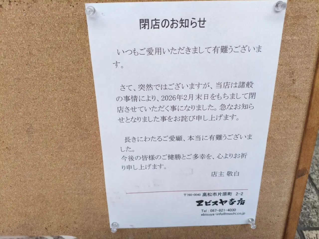 高松市中心部の商店街に長年親しまれてきた老舗餅店「ヱビスヤ本店(エビスヤ)」が、2026年2月28日をもって閉店することが発表されました。
