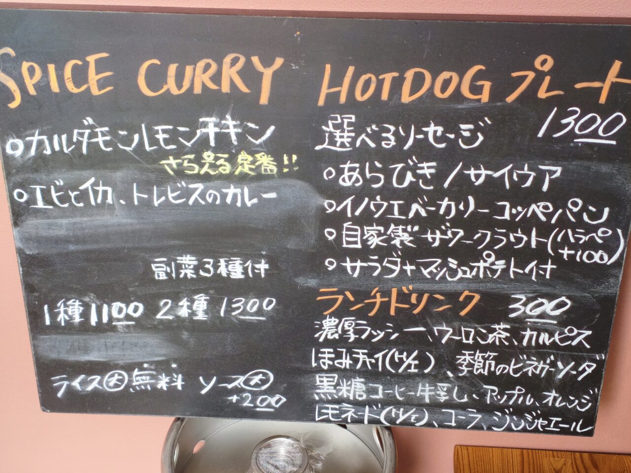 看板メニューは、オリジナルのカレー。そして、店主のソーセージ作りのスキルを活かした、ソーセージを使ったホットドッグです。