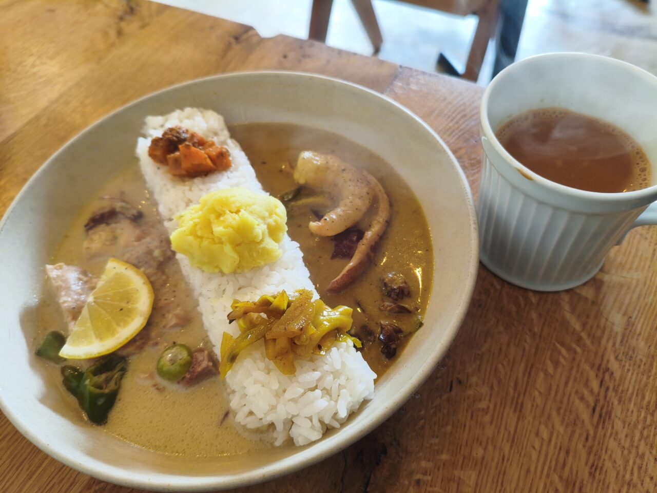 一方はチキンが入ったもの。まろやかな中にピリッとスパイスが効いていて、レモンの後味も爽やかです。