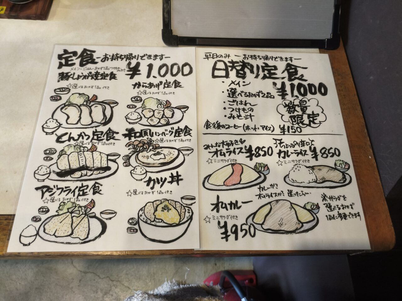 その日によって内容は変わりますが、メインのおかずに加えて、ご飯・味噌汁・小鉢などが付くボリューム満点の内容です。