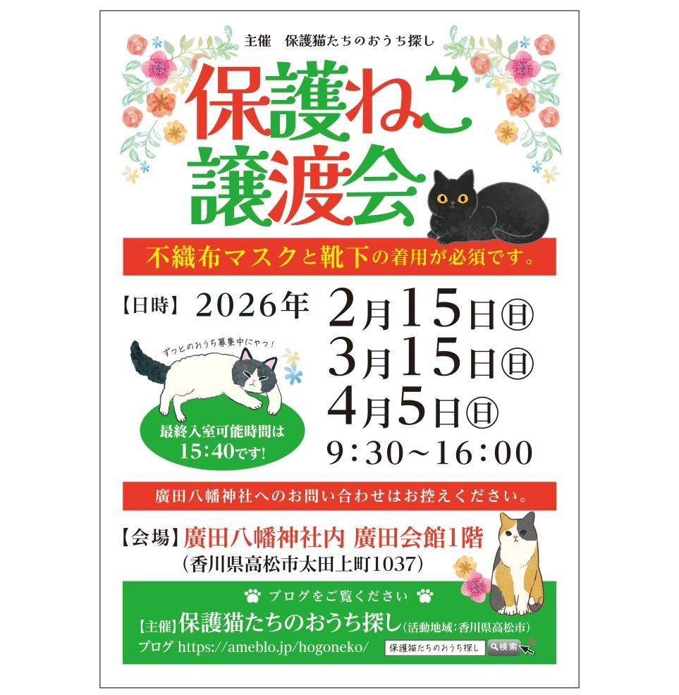 来たる2026年3月15日(日)に、「保護猫譲渡会withねこまるしぇ」が廣田八幡神社廣田会館1階で開催されます!