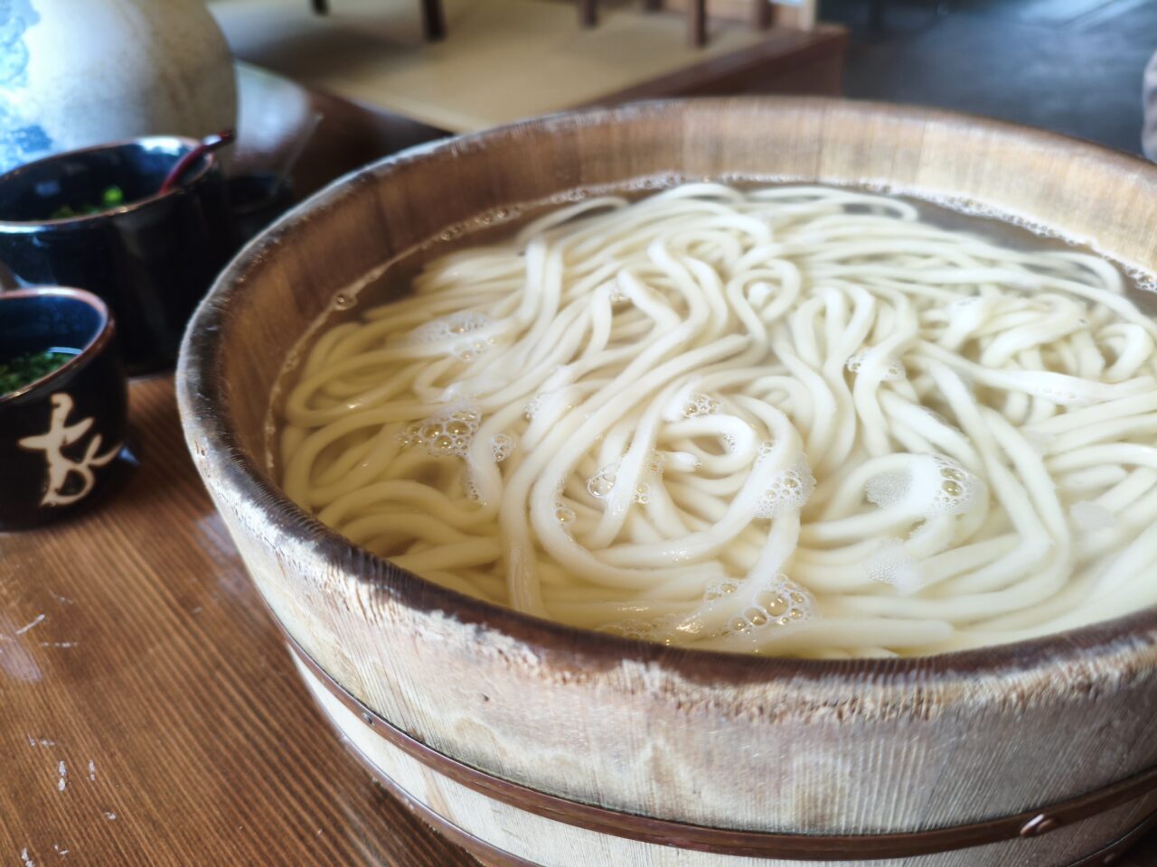 大きな木製のたらいに入ったうどんを、みんなで取り分けて食べるスタイルで、観光客にも人気のメニューです。