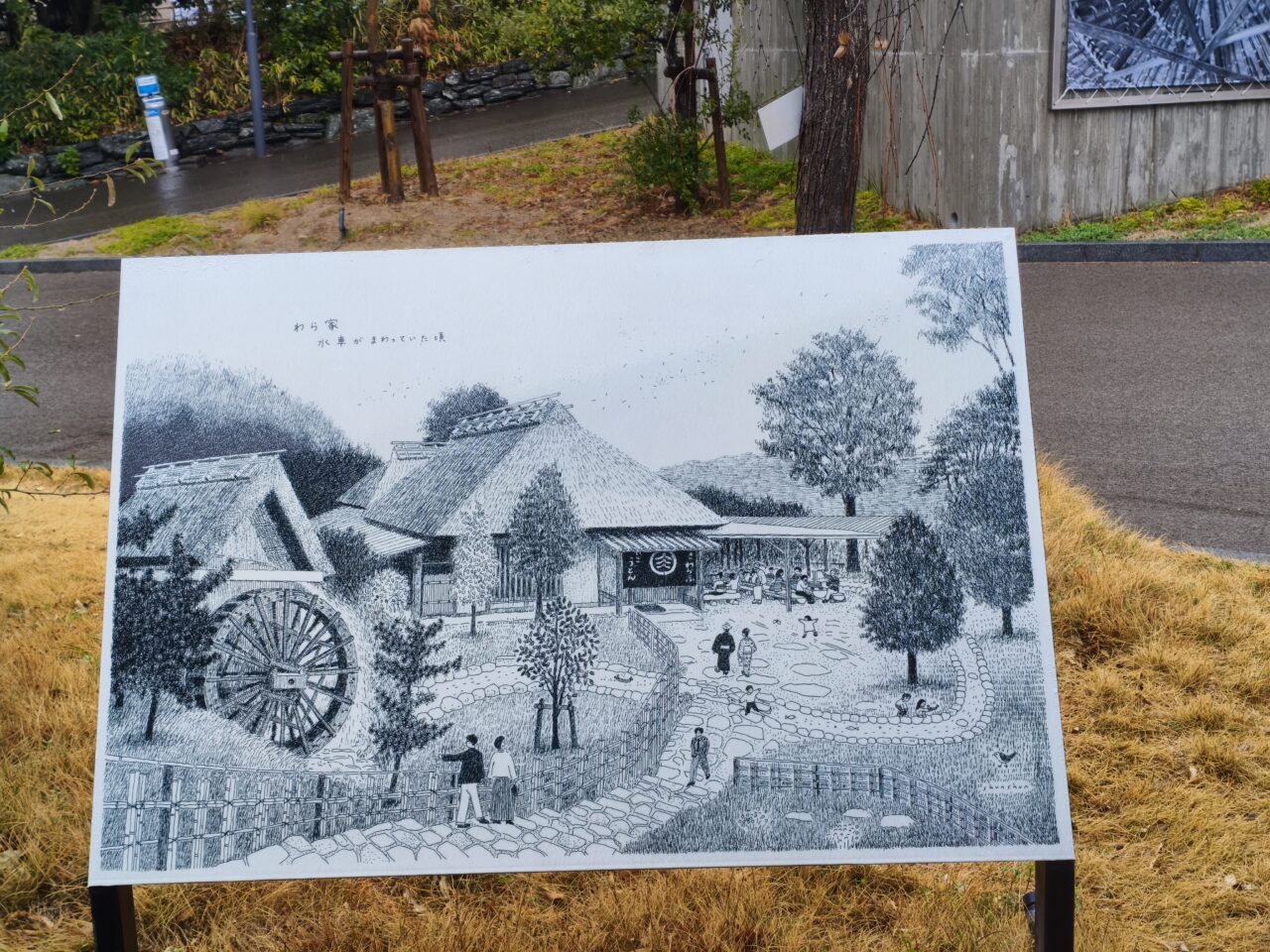 店の前には風情ある水車があり、茅葺き屋根の家屋とあいまって、まるで昔の農村に迷い込んだような雰囲気。