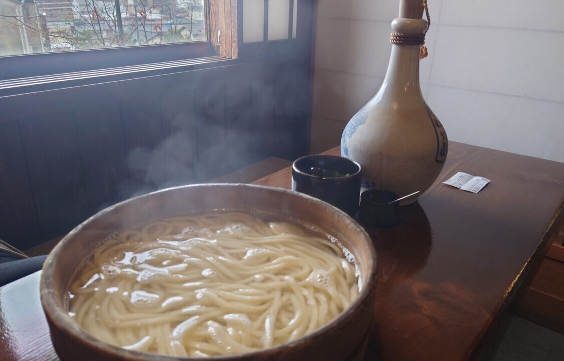 大きな木製のたらいに入ったうどんを、みんなで取り分けて食べるスタイルで、観光客にも人気のメニューです。