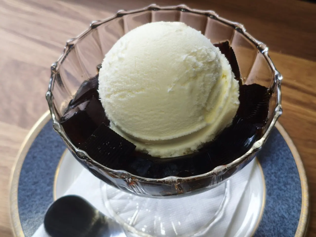 これまた深いコクのあるゼリーにさっぱりした甘さの大きなバニラアイスが乗って、ぜいたくな気分に。