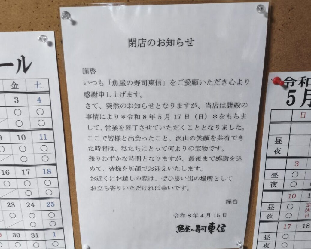 長きにわたり、美味しいお寿司を届けてくれたスタッフの皆様に感謝しつつ、最後の日まで活気ある「東信」らしい時間が続くことを願っています。