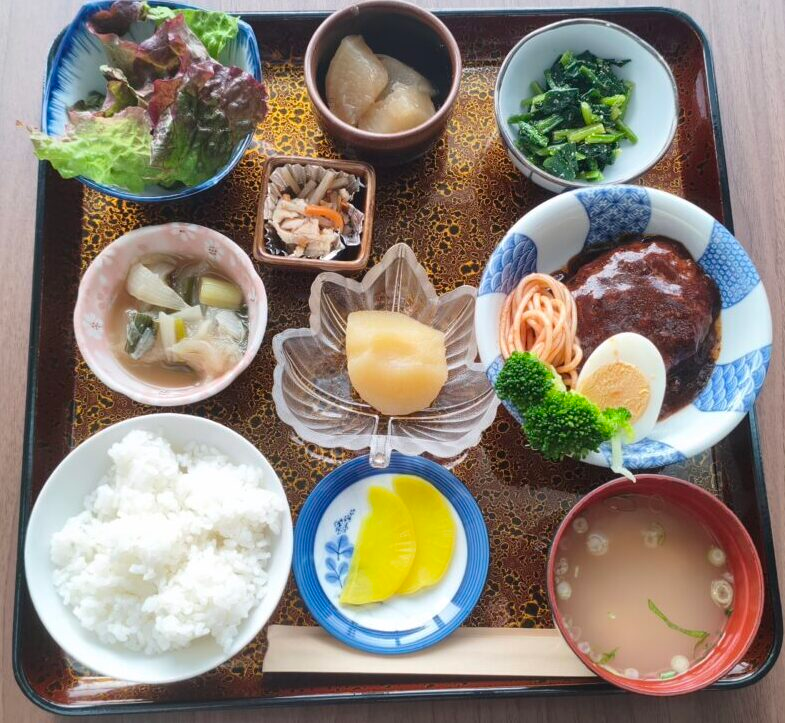 ハンバーグや煮サバなどメインは日替わりで、4種の小鉢にご飯、みそ汁、ドリンクまで付いた大満足の内容です。毎日通いたくなる家庭的な味わいが魅力ですよ。